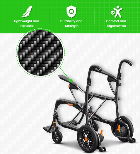 가벼운 디자인 : 탄소 섬유는 강철 또는 알루미늄과 같은 전통적인 재료보다 훨씬 가볍기 때문에 휠체어를 쉽게 조작하고 운반 할 수 있습니다. 이식성 : 탄소 섬유 휠체어의 가벼운 특성은 특히 공항이나 관광지와 같은 시나리오에서 여행에 이상적입니다. 그들은 휴대하고 보관하기 쉽습니다.